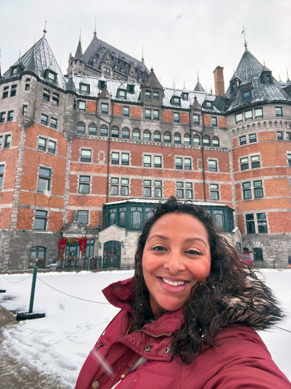Fairmont Château Frontenac Review : A latina woman (the author) jumping in front of Chateau Frontenac during her visit in winter 2016